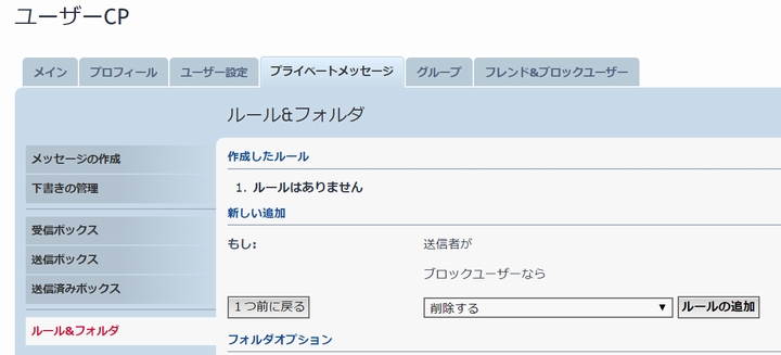 上記サンプルでは、表示したくないユーザをブロックユーザに指定した上で、そのブロックユーザからのPMを受信した場合に無条件に削除する設定です。「ルールの追加」ボタンをクリックすることで確定します。