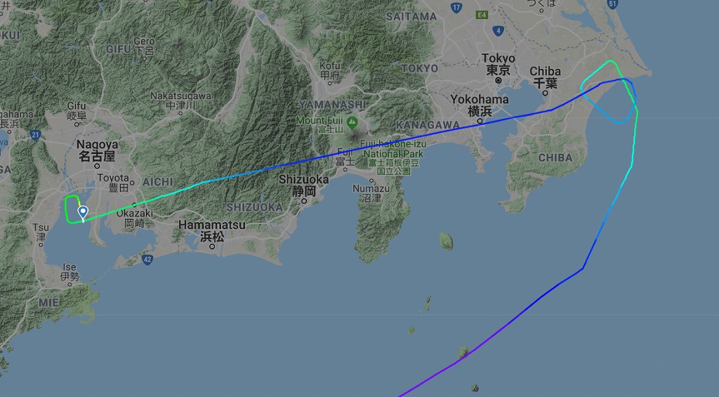 海上から陸地に入って約10km地点で高度を上げて、しかもそのまま高度を上げながら一周回って名古屋へ向かう