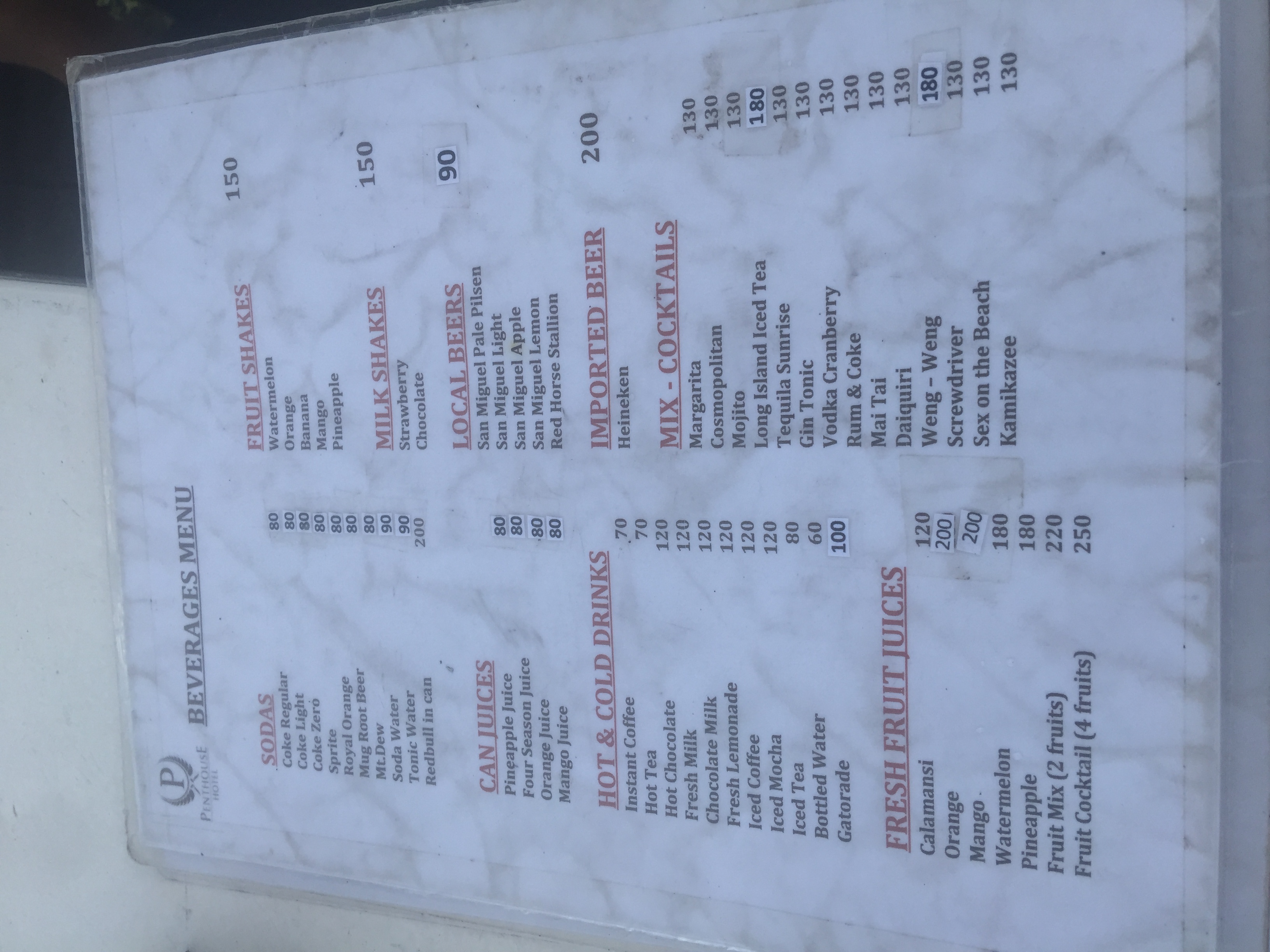 あと屋上のプールは、晴れているとのんびり出来て良かったです。食事は大して美味しく無いですが、ドリンクが思ったよりかは安いと思いました。(ローカル瓶ビールで80PHP,ちょっとしたカクテルで130PHP位だったかと)また、深夜にバーのつもりで屋上に行くと、ファランとバーガールがかなり上機嫌でいちゃついていて、盛り上がってきたらバーガールがプール内カウンターにワンワンスタイルになって、その後ろからファランがお尻に顔をなすりつけたり、最後にはトップレスになっていました(汗)たまぁに本○を始めるのもいるとのこと。ちょっとしかめっ面してましたが(汗)