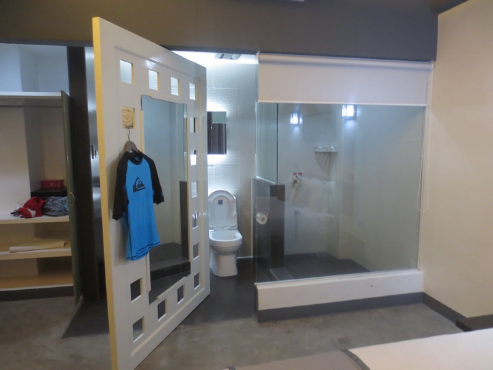 シャワールームと部屋の間に扉がないこと。回転式の扉のようなものがありますが、それを閉めても、その横は1m程度開いています。また、ドアには小窓がいっぱい空いています。