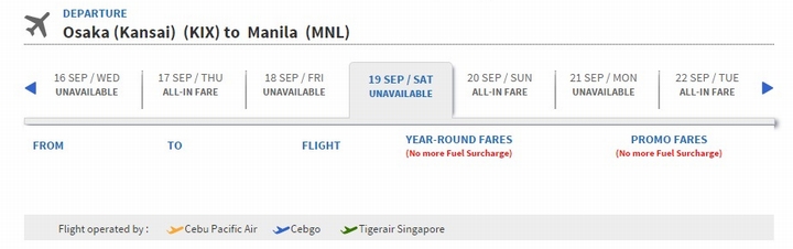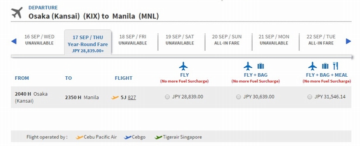 関空発着のセブパシフィックの往路便(9月19日(土曜))と、復路便(9月24日(木曜))が、復活して座席が表示されるようになっていますね。