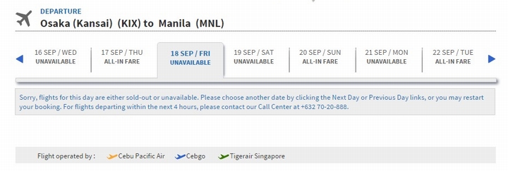 9月26日(木)のマニラ-関空の帰路便も同じ表示になっているようなので、やっぱり売り切れ表示と判断しました。