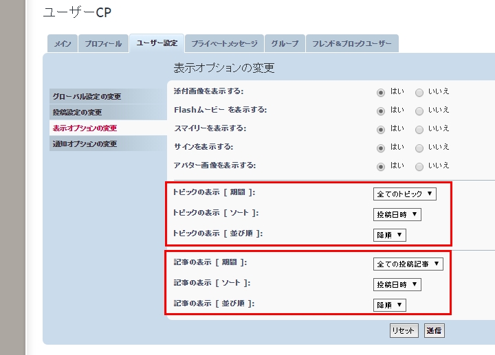「ユーザーCP」の他のタブで色々と個人設定できますので、ご自身で使いやすいように設定してみてください。