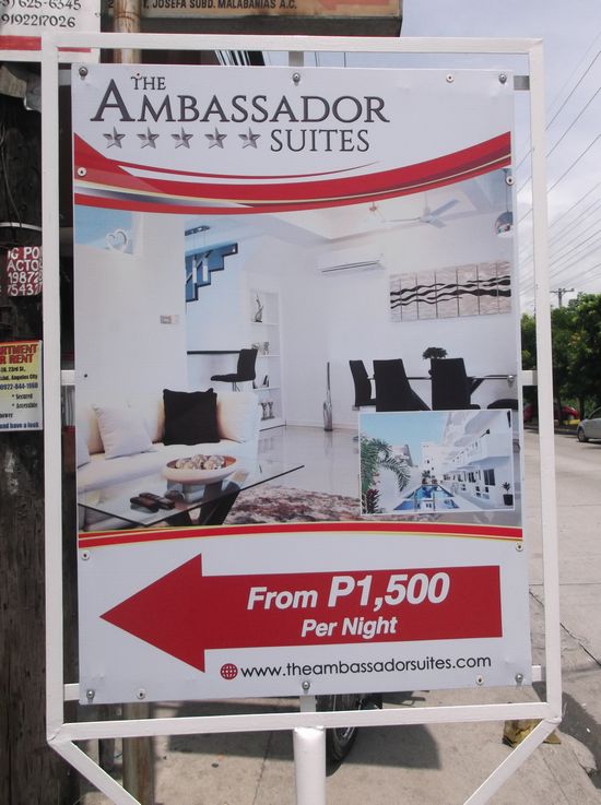 写真の建物は、バルデス通りの角で写しましたが、The Ambassador Suites は、建物の先を右折した所のようです。