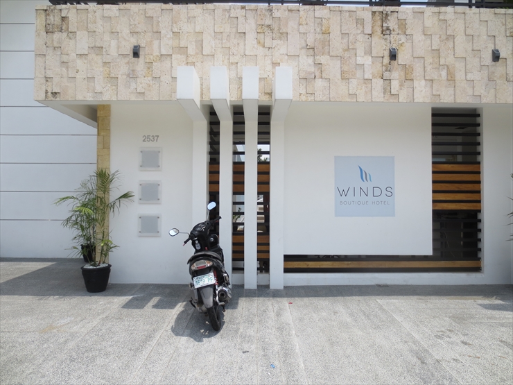 今回借りてたレンタルバイクとホテルの玄関です。左側に入り口がありますが、昼間でもなぜかいつも施錠されていました。(笑