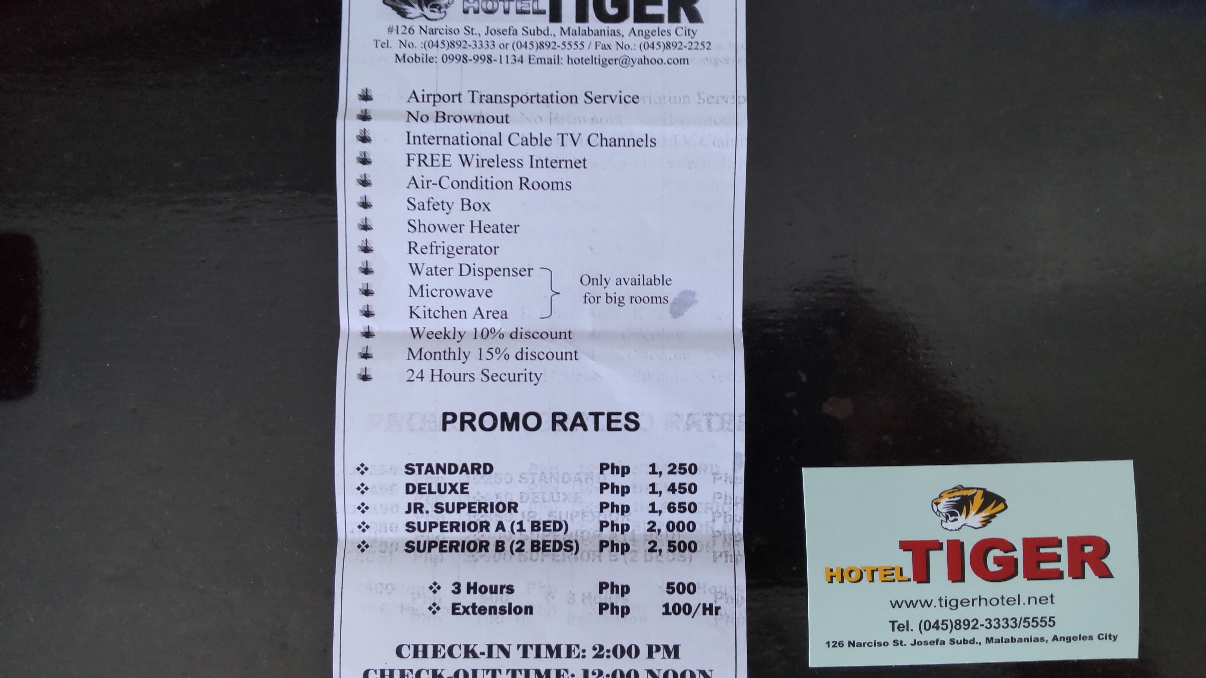 で12時から14時の2時間は荷物持ってどうしようか?次のホテルに預けて軽くバーホッピングでもいいけど、1件で500phpから掛かるからなぁ、と考えていたのですが、フロントで確認したらレイトチェックアウトも1時間100phpで利用可能でした。